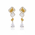 The Cerah Geometric Drops are a luxurious cascade of colour and brilliance. Featuring a sequence of yellow and clear CZ stones in cushion-cut and teardrop shapes, these earrings create a vibrant, multidimensional sparkle. Their geometric arrangement offers a glamorous, vintage-inspired statement perfect for evening wear or special occasions.